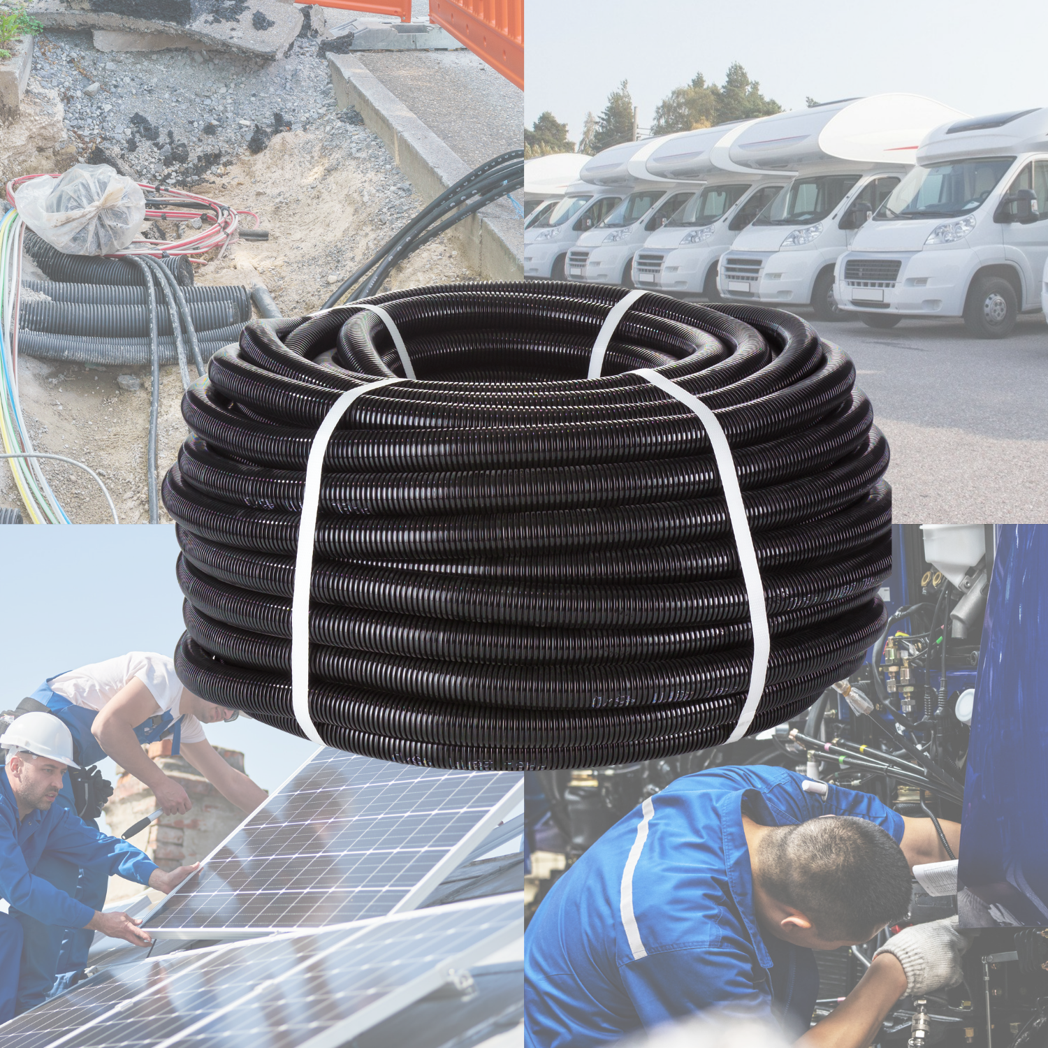Je nach Anwendung kann auf bestimmte Eigenschaften nicht verzichtet werden, andere sind jedoch zweitrangig. So muss ein Wellrohr, das an einer Photovoltaik- Anlage verbaut wird, UV-witterungsstabil sein. Ein Wellrohr, das unter Stampf- oder Rüttelbeton verlegt werden soll, muss hingegen mit großem Druck klarkommen, aber nicht durch hohe Flexibilität glänzen. In den Bereichen Fahrzeugbau, Spezialfahrzeugbau, Caravan- und Camper- (Um)Bau müssen hohe Brandschutzbestimmungen erfüllt werden und das Wellrohr muss gegen Chemikalien, wie Kraftstoffe widerstandsfähig sein. Ein Polyolefin- Wellrohr, das in Hohlwänden und Zwischendecken verlegt werden soll, kann sich bei UV-Beständigkeit und chemischen Widerständen hintenanstellen, sollte aber leicht und sehr flexibel sein. Das erleichtert die Installation. Hier einige branchenbezogene Beispiele: