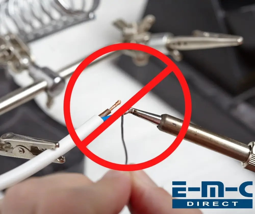 Nach dem Entfernen von Mantel und Isolierung liegt die Litze blank und ein fixes Verlöten ist verführerisch, jedoch nicht ratsam. Grund hierfür ist zum einen die dadurch entstehende Veränderung des Leiterquerschnitts und eine daraus resultierende Veränderung des Stromflusses, zum anderen die Brandgefahr, die von abstehenden, einzelnen Drähten ausgeht. Diese können nämlich bei benachbarten Kontakten zu Kurzschlüssen führen. Zudem ist das verwendete Lötzinn meist nicht so temperaturbeständig wie nötig, wenn die Kabel professionellem Nutzen dienen sollen. Im schlimmsten Fall löst sich eine solche Verbindung in Wohlgefallen auf, wenn es heiß hergeht und sorgt für Kurzschlüsse und schlimme Brände. Hier sei kurz angemerkt, dass fast jeder dritte Brand in Deutschland durch Elektrizität verursacht wird.