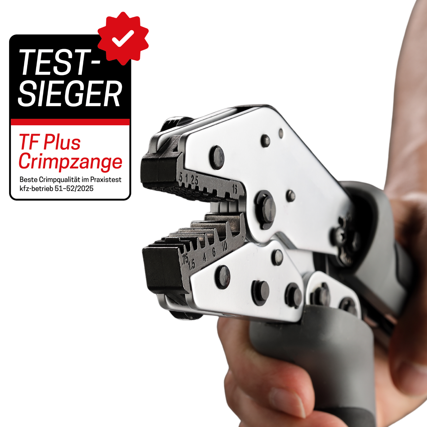 Dabei trat TOOLOVA® TF Plus gegen renommierte Wettbewerber an. Die Crimpzange von EMC-direct überzeugt auf ganzer Linie und erhielt in allen fünf Bewertungskategorien – Betätigung beim Crimpvorgang, Entriegelung der Zwangssperre, Crimpergebnis und Schmierstoffunempfindlichkeit der Griffstücke – die Bestnote „sehr gut“.