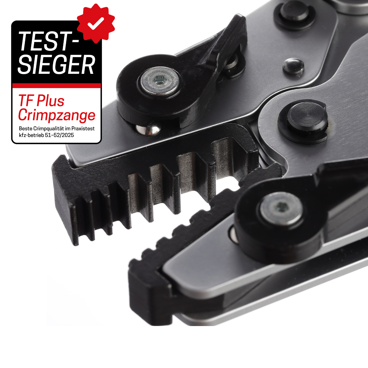 Ein entscheidendes Differenzierungsmerkmal der TOOLOVA® TF Plus ist ihr Kopf-Design. Während die meisten Mitbewerber im Test auf fest verbaute Crimpeinsätze setzen, ist die Zange von EMC-direct mit austauschbaren Einsätzen ausgestattet. Der Test widerlegt eindrucksvoll das Vorurteil, dass flexible Wechselsysteme Kompromisse bei der Präzision bedeuten: Das mechanische und optische Crimpergebnis der TF Plus wurde als „sehr gut“ bewertet. Es garantiert eine sichere, feste Verbindung sowie eine kompakte Crimpstelle.